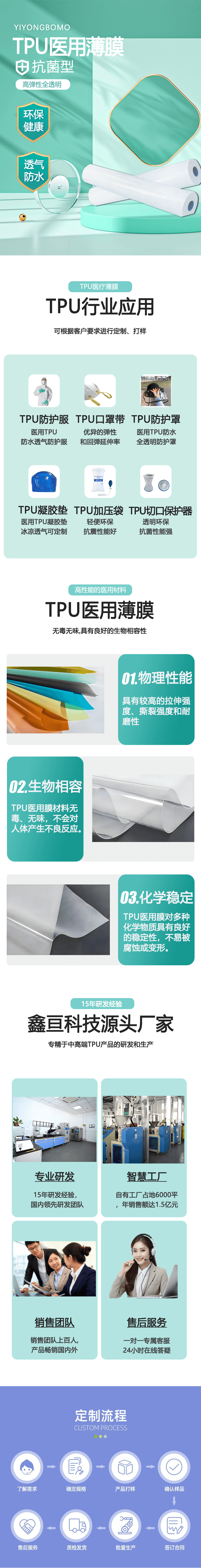 TPU復合膜具有高彈性、耐磨、環保無毒等特性,廣泛應用于醫療、汽車、運動裝備等領域。支持定制,提供防水透濕、阻燃抗菌解決方案